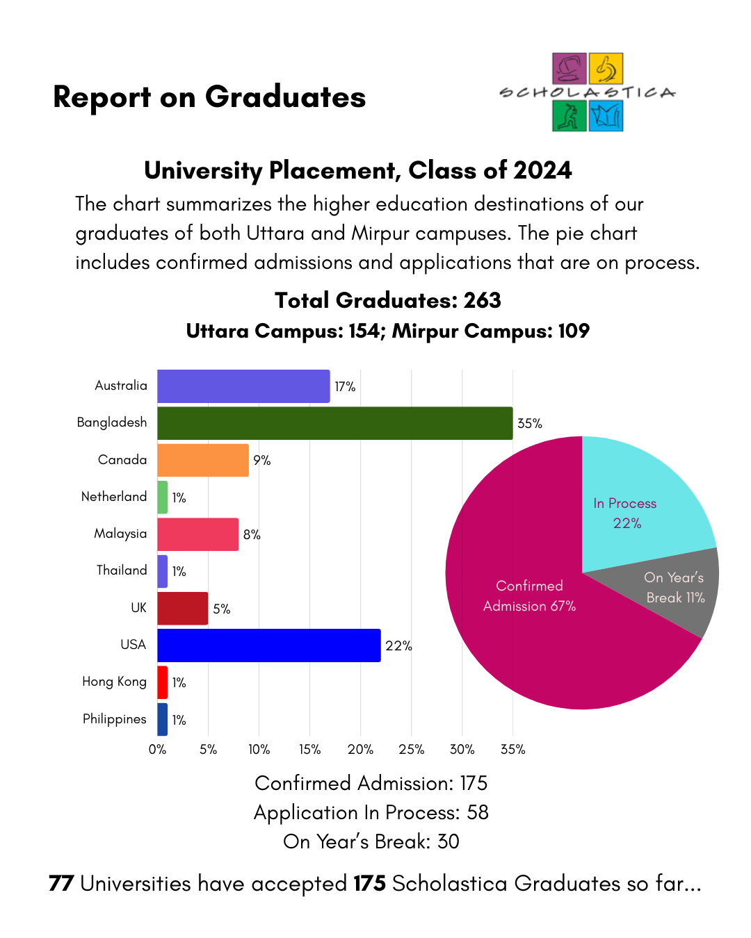 Our graduates have attended prestigious universities in the US including Harvard, Princeton, Yale, Stanford and Brown and renowned colleges and universities in the United Kingdom, Canada, Australia and within Bangladesh as well.